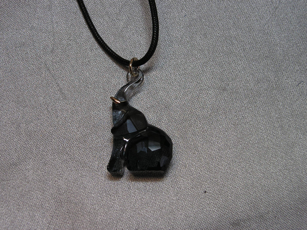 The grey elephant pendant is approx 1 1/4" long and comes with a black cord necklace.