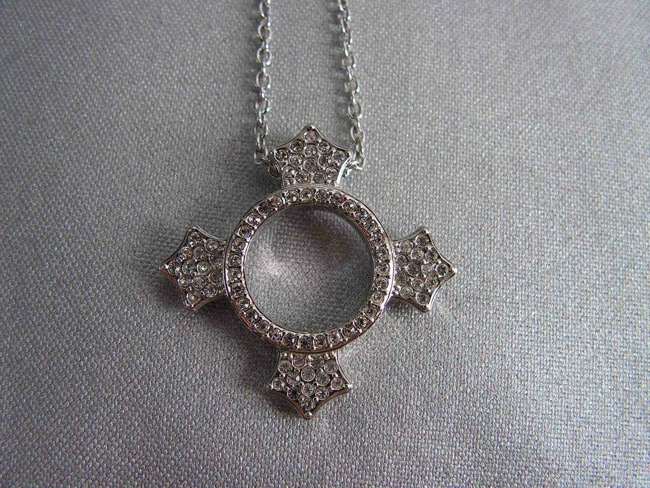 This gorgeous necklace features an unusual silver-tone clear crystal pave pendant on a silver-tone chain.